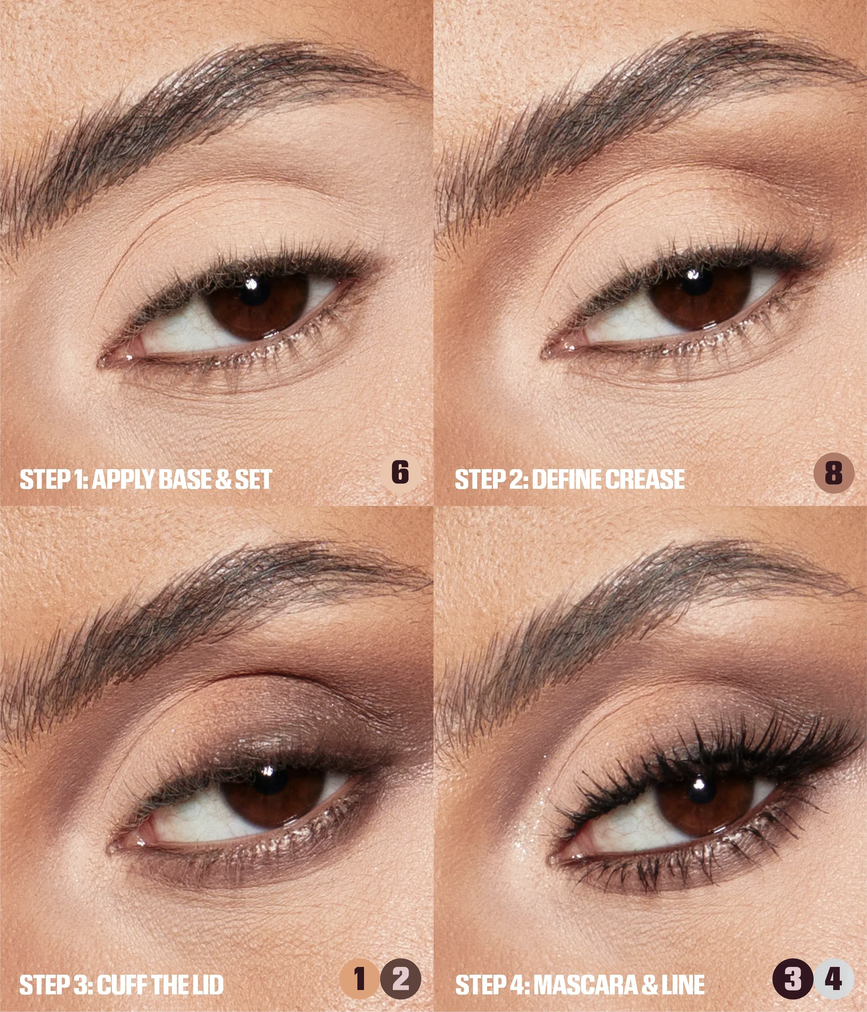 - I’m obsessed with ‘eye-cuffing’; simply use a darker shade in the crease for a dramatic arch that defines the lid.