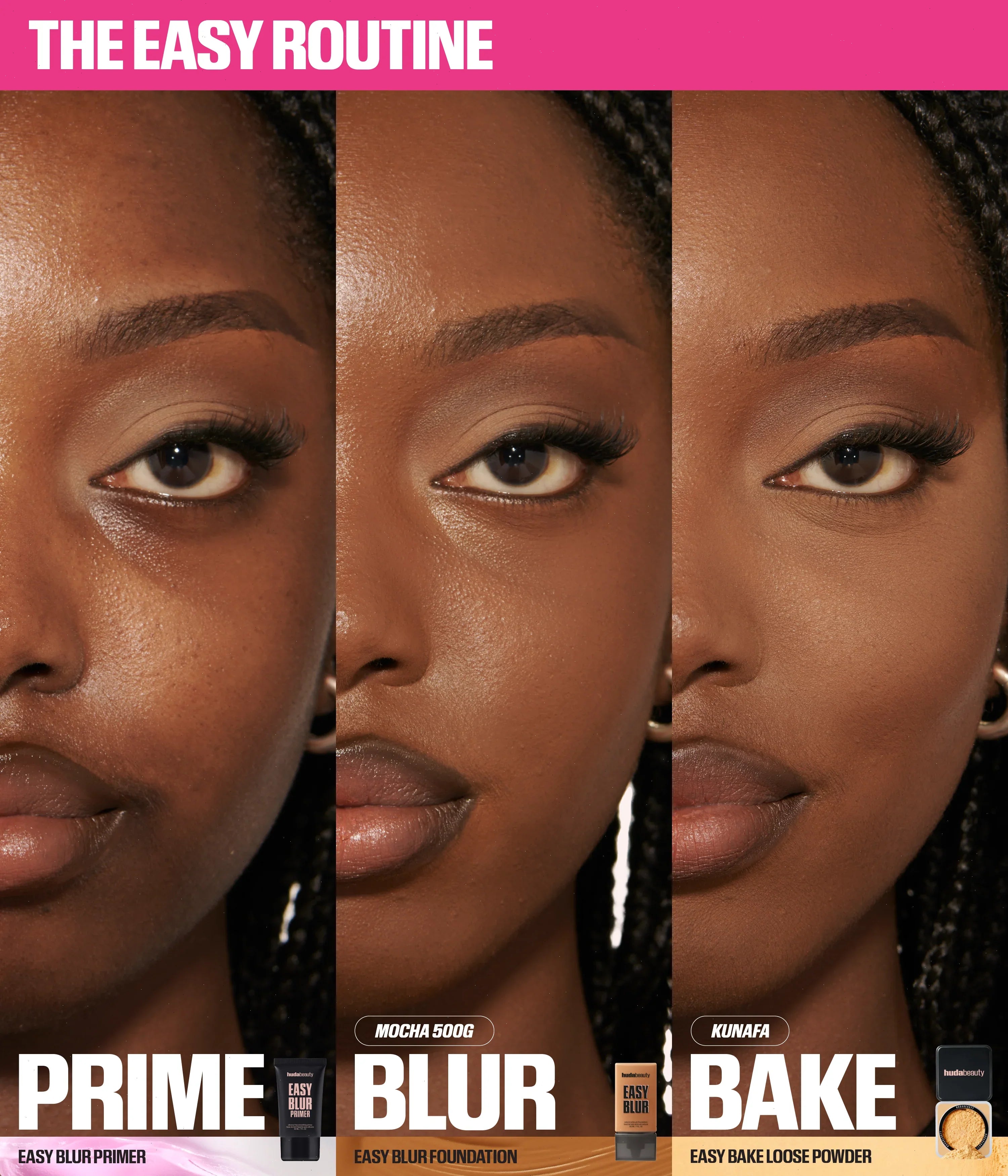 The Huda Beauty Easy Bake Loose Powders are inspired by Huda’s strong belief that the technique of baking is a key step to a flawless finish while ensuring long-lasting, melt-proof makeup. This extremely light and silky texture blends seamlessly into the skin leaving it matte with a hint of sheen, for a luminous finish that controls shine throughout the day. The powders work to subtly color correct and highlight different contours of the face, leaving a translucent veil of color on your skin.