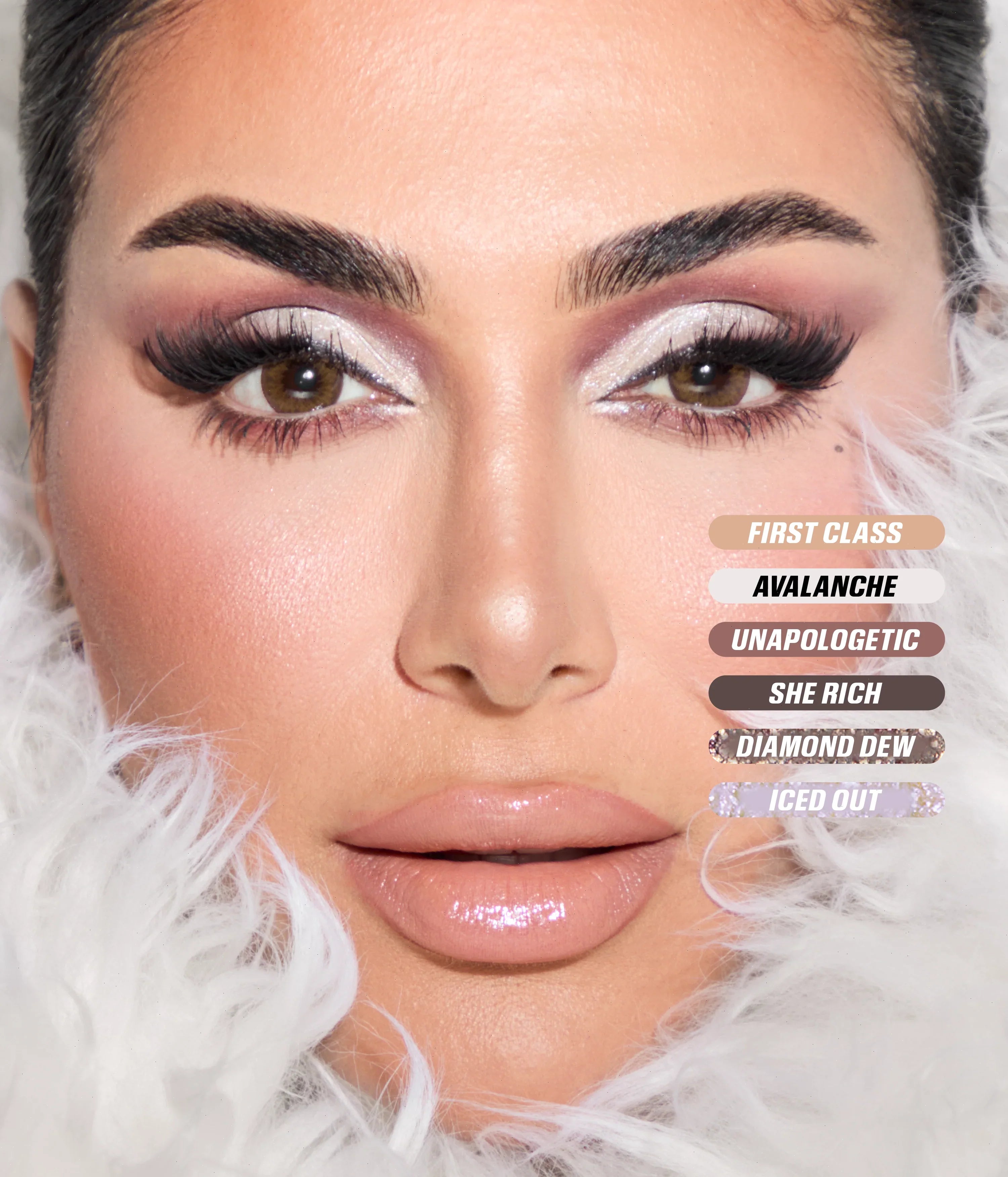 ICED OUT: CALCIUM ALUMINUM BOROSILICATE, OCTYLDODECYL STEAROYL STEARATE, PENTAERYTHRITYL TETRAISOSTEARATE, SIMMONDSIA CHINENSIS (JOJOBA) SEED OIL, HYDROGENATED STYRENE/BUTADIENE COPOLYMER, TIN OXIDE, PROPANEDIOL, DECYLENE GLYCOL, 1,2-HEXANEDIOL, CAPRYLHYDROXAMIC ACID, TRIS-BHT MESITYLENE, TITANIUM DIOXIDE/CI 77891. HIGH LIFE, FAUX FUR, POISED, COLD PLUNGE, ONESELF, FIRST CLASS: MICA, ORYZA SATIVA (RICE) POWDER, SILICA, MAGNESIUM MYRISTATE, COCOGLYCERIDES, PENTAERYTHRITYL TETRAISOSTEARATE, PROPANEDIOL, DECYLENE GLYCOL, BUTYROSPERMUM PARKII (SHEA) BUTTER, MAGNESIUM STEARATE, C10-18 TRIGLYCERIDES, 1,2-HEXANEDIOL, LAUROYL LYSINE, CAPRYLHYDROXAMIC ACID. MAY CONTAIN (+/-): TITANIUM DIOXIDE/CI 77891, IRON OXIDES/CI 77491, IRON OXIDES/CI 77492, IRON OXIDES/CI 77499, MANGANESE VIOLET/CI 77742, RED 40 LAKE/CI 16035. PLATINUM: MICA, CALCIUM SODIUM BOROSILICATE, SYNTHETIC FLUORPHLOGOPITE, DIMETHICONE, ZINC STEARATE, DIISOSTEARYL MALATE, OCTYLDODECYL STEAROYL STEARATE, STEARYL DIMETHICONE, SILICA, TRIMETHYLSILOXYSILICATE, ETHYLHEXYLGLYCERIN, PROPANEDIOL, DECYLENE GLYCOL, 1,2-HEXANEDIOL, TIN OXIDE, CAPRYLHYDROXAMIC ACID, ALUMINUM POWDER/CI 77000, TITANIUM DIOXIDE/CI 77891, IRON OXIDES/CI 77499. UNAPOLOGETIC, IDGAF: MICA, ORYZA SATIVA (RICE) POWDER, SILICA, MAGNESIUM MYRISTATE, COCOGLYCERIDES, PENTAERYTHRITYL TETRAISOSTEARATE, PROPANEDIOL, DECYLENE GLYCOL, BUTYROSPERMUM PARKII (SHEA) BUTTER, MAGNESIUM STEARATE, C10-18 TRIGLYCERIDES, 1,2-HEXANEDIOL, LAUROYL LYSINE, MALTODEXTRINE, CAPRYLHYDROXAMIC ACID. MAY CONTAIN (+/-): CARMINE/CI 75470, TITANIUM DIOXIDE/CI 77891, IRON OXIDES/CI 77491, IRON OXIDES/CI 77492, IRON OXIDES/CI 77499, MANGANESE VIOLET/ CI 77742, ULTRAMARINES/CI 77007. GOLD STANDARDS: MICA, SYNTHETIC FLUORPHLOGOPITE, CALCIUM ALUMINUM BOROSILICATE, SILICA, HYDROGENATED POLYISOBUTENE, ZINC STEARATE, DIMETHICONE, OCTYLDODECYL STEAROYL STEARATE, TRIPELARGONIN, TIN OXIDE, ETHYLENE/PROPYLENE/STYRENE COPOLYMER, LAUROYL LYSINE, PROPANEDIOL, DECYLENE GLYCOL, DIMETHICONOL, 1,2-HEXANEDIOL, BUTYLENE/ETHYLENE/STYRENE COPOLYMER, CAPRYLHYDROXAMIC ACID, PENTAERYTHRITYL TETRA-DI-T-BUTYL HYDROXYHYDROCINNAMATE, TITANIUM DIOXIDE/CI 77891, IRON OXIDES/CI 77491. AVALANCHE: MICA, ORYZA SATIVA (RICE) POWDER, MAGNESIUM MYRISTATE, SILICA, LAUROYL LYSINE, COCOGLYCERIDES, PENTAERYTHRITYL TETRAISOSTEARATE, POLYACRYLATE CROSSPOLYMER-6, PROPANEDIOL, BUTYROSPERMUM PARKII (SHEA) BUTTER, DECYLENE GLYCOL, MAGNESIUM STEARATE, C10-18 TRIGLYCERIDES, 1,2-HEXANEDIOL, CAPRYLHYDROXAMIC ACID, TITANIUM DIOXIDE/CI 77891, ULTRAMARINES/CI 77007, RED 40 LAKE/CI 16035, YELLOW 5 LAKE/CI 19140. AURORA: CALCIUM ALUMINUM BOROSILICATE, SYNTHETIC FLUORPHLOGOPITE, DIMETHICONE, ZINC STEARATE, MICA, DIISOSTEARYL MALATE, OCTYLDODECYL STEAROYL STEARATE, STEARYL DIMETHICONE, TRIMETHYLSILOXYSILICATE, ETHYLHEXYLGLYCERIN, SILICA, PROPANEDIOL, DECYLENE GLYCOL, 1,2-HEXANEDIOL, TIN OXIDE, CAPRYLHYDROXAMIC ACID, IRON OXIDES/CI 77491, TITANIUM DIOXIDE/CI 77891, ALUMINUM POWDER/CI 77000, MANGANESE VIOLET/CI 77742. VVS: CALCIUM ALUMINUM BOROSILICATE, OCTYLDODECYL STEAROYL STEARATE, PENTAERYTHRITYL TETRAISOSTEARATE, CALCIUM SODIUM BOROSILICATE, SIMMONDSIA CHINENSIS (JOJOBA) SEED OIL, SYNTHETIC FLUORPHLOGOPITE, SILICA, HYDROGENATED STYRENE/BUTADIENE COPOLYMER, TIN OXIDE, PROPANEDIOL, DECYLENE GLYCOL, 1,2-HEXANEDIOL, CAPRYLHYDROXAMIC ACID, TRIS-BHT MESITYLENE, TITANIUM DIOXIDE/CI 77891, ALUMINUM POWDER/CI 77000, IRON OXIDES/CI 77491, IRON OXIDES/ CI 77492. SHE RIIICH: MICA, ZEA MAYS (CORN) STARCH, MAGNESIUM MYRISTATE, SILICA, DIMETHICONE, PENTAERYTHRITYL TETRAISOSTEARATE, OCTYLDODECANOL, MALTODEXTRIN, C10-18 TRIGLYCERIDES, DECYLENE GLYCOL, SYNTHETIC BEESWAX, LAUROYL LYSINE, IRON OXIDES/CI 77499, IRON OXIDES/CI 77491, CARMINE/CI 75470. BLING: RAYON, HYDROGENATED POLYISOBUTENE, GLASS BEADS, GLYCERIN, STYRENE/ACRYLATES COPOLYMER, WATER/AQUA/EAU, SYNTHETIC WAX, UREA, BENZYL ALCOHOL, PHENOXYETHANOL, HYDROGENATED STYRENE/BUTADIENE COPOLYMER, PROPANEDIOL, DECYLENE GLYCOL, 1,2-HEXANEDIOL, CAPRYLHYDROXAMIC ACID, ALUMINUM POWDER/CI 77000. DIAMOND DEW: CALCIUM ALUMINUM BOROSILICATE, OCTYLDODECYL STEAROYL STEARATE, PENTAERYTHRITYL TETRAISOSTEARATE, SILICA, SYNTHETIC FLUORPHLOGOPITE, SIMMONDSIA CHINENSIS (JOJOBA) SEED OIL, HYDROGENATED STYRENE/BUTADIENE COPOLYMER, TIN OXIDE, PROPANEDIOL, DECYLENE GLYCOL, 1,2-HEXANEDIOL, CAPRYLHYDROXAMIC ACID, TRIS-BHT MESITYLENE, ALUMINUM POWDER/CI 77000, TITANIUM DIOXIDE/CI 77891, IRON OXIDES/CI 77491. LAVISH: MICA, ZEA MAYS (CORN) STARCH, MAGNESIUM MYRISTATE, SILICA, DIMETHICONE, PENTAERYTHRITYL TETRAISOSTEARATE, OCTYLDODECANOL, MALTODEXTRIN, C10-18 TRIGLYCERIDES, DECYLENE GLYCOL, SYNTHETIC BEESWAX, LAUROYL LYSINE, IRON OXIDES/CI 77499, IRON OXIDES/CI 77491, IRON OXIDES/CI 77492, TITANIUM DIOXIDE/CI 77891.