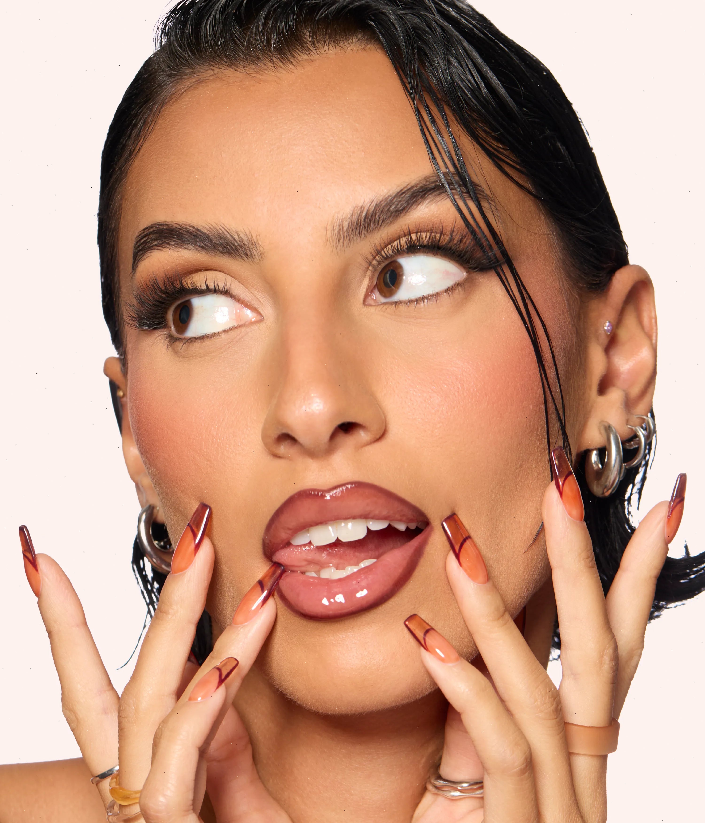 Available in 8 lip stain colors, pair with one of our Faux Filler Jelly Lip Oils to recreate Huda’s jelly - stained lip makeup look.