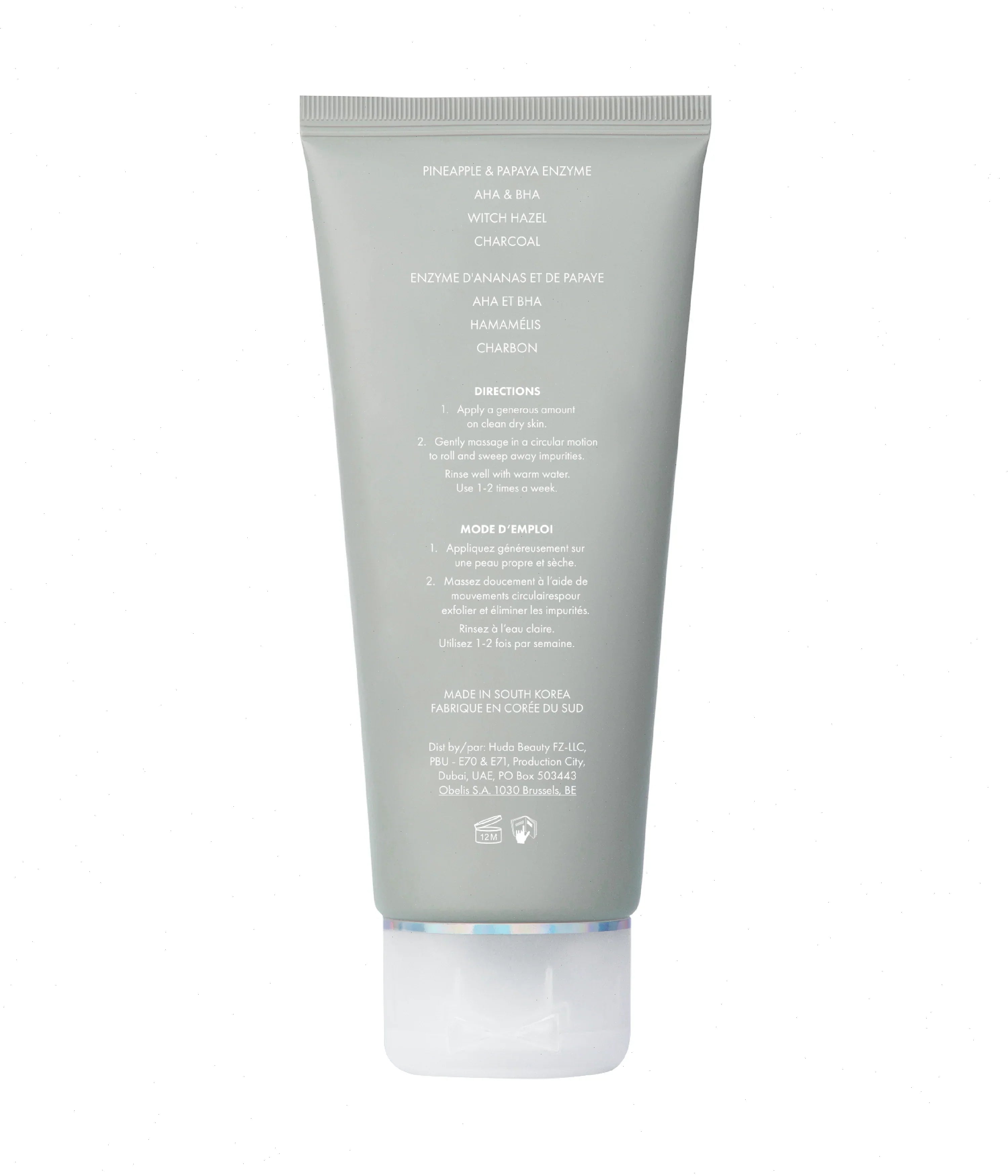 water/aqua/eau, cellulose, butylene glycol, propylene glycol, alcohol, 1,2-hexanediol, bromelain, ananas sativus (pineapple) fruit extract, papain, carica papaya (papaya) fruit extract, citric acid, lactic acid, malic acid, salicylic acid, tartaric acid, glycolic acid, hamamelis virginiana (witch hazel) extract, charcoal powder, glycerin, cocos nucifera (coconut) fruit extract, prunus amygdalus dulcis (sweet almond) oil, saccharum officinarum (sugarcane) extract/saccharum officinarum/extrait de canne à sucre, acer saccharum (sugar maple) extract, mannitol, mangifera indica (mango) fruit extract, musa sapientum (banana) fruit extract, passiflora edulis (passionfruit) fruit extract, citrus aurantium dulcis (orange) fruit extract, citrus limon (lemon) fruit extract, vaccinium myrtillus (blueberry) fruit extract, polysorbate 20, carbomer, tromethamine, disodium edta, phenoxyethanol, fragrance/parfum.